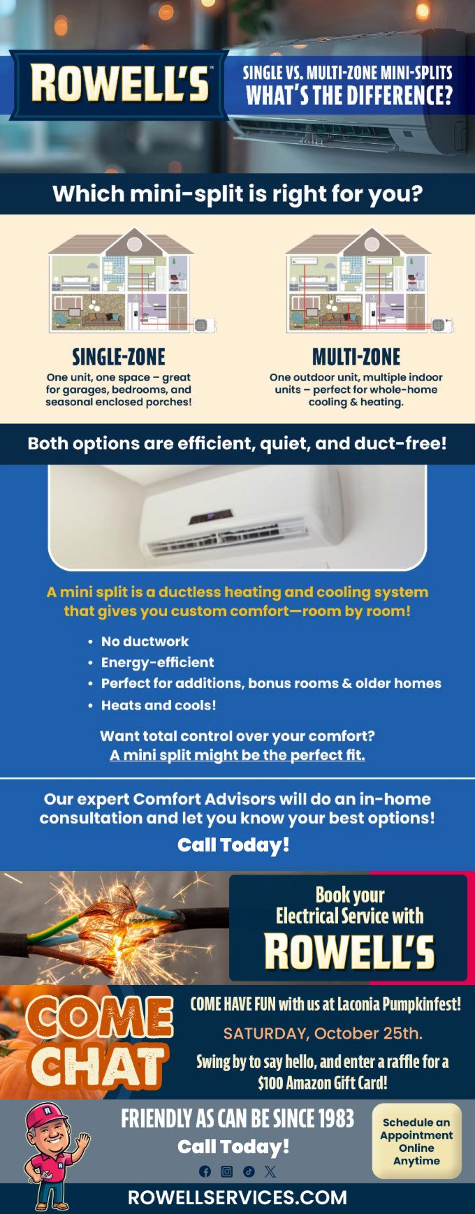 "Friendly As Can Be Since 1983!" When you need help with your plumbing, drains, heating, cooling or electrical in Merrimack, you can always rely on Rowell's Services! Call us now or book online!